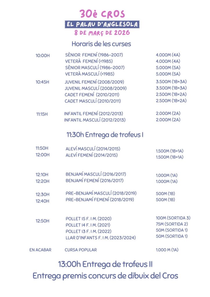Ens alegra anunciar-vos que el proper 8 de març de 2026 es celebrarà el 30è Cros El Palau d’Anglesola! 🏃🏿♂️🏃🏽🏃🏽♀️🏃🏿♂️🏃🏽🏃🏽♀️
